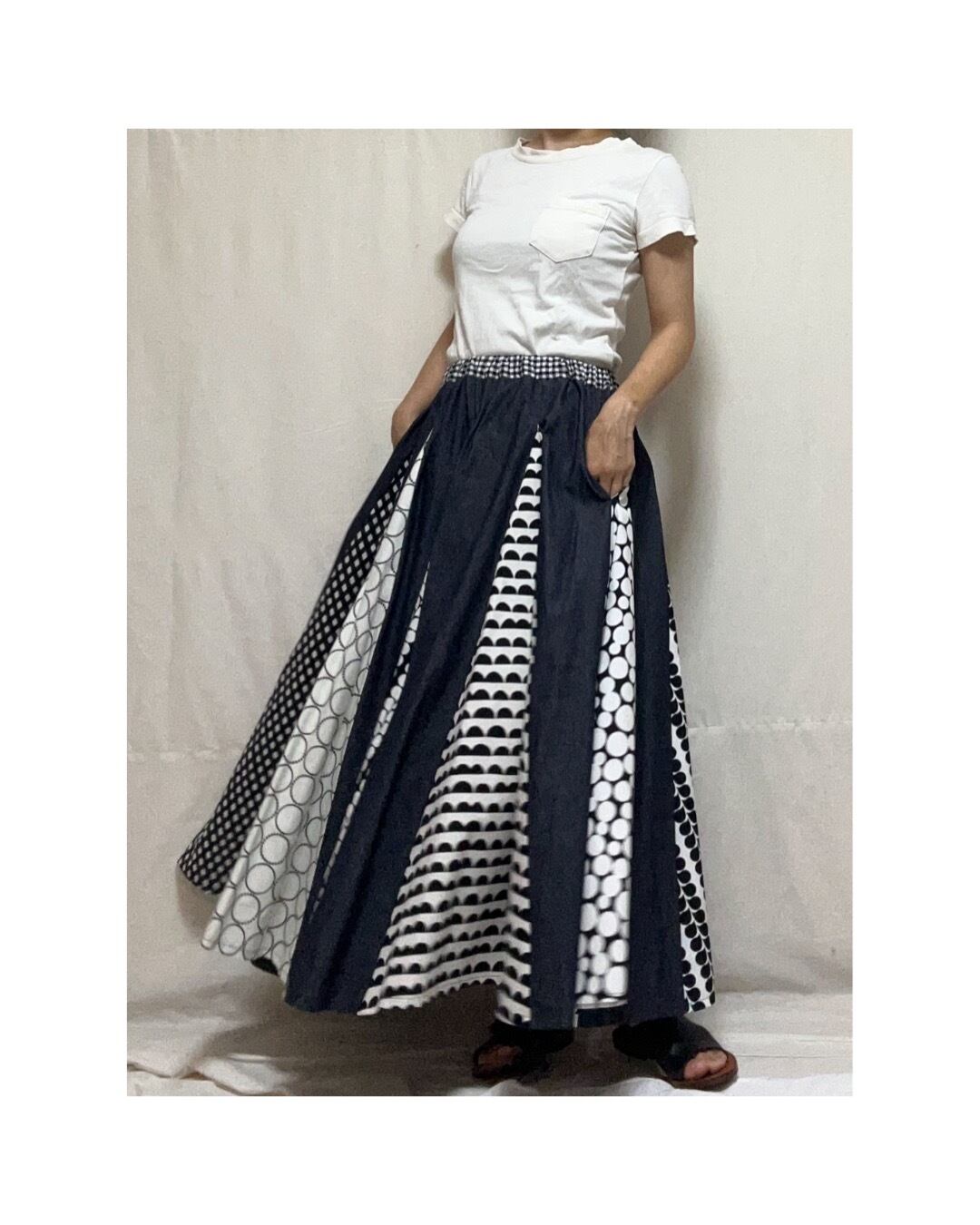 20枚の生地を繋ぎ合わせて作ったサーキュラースカートです。