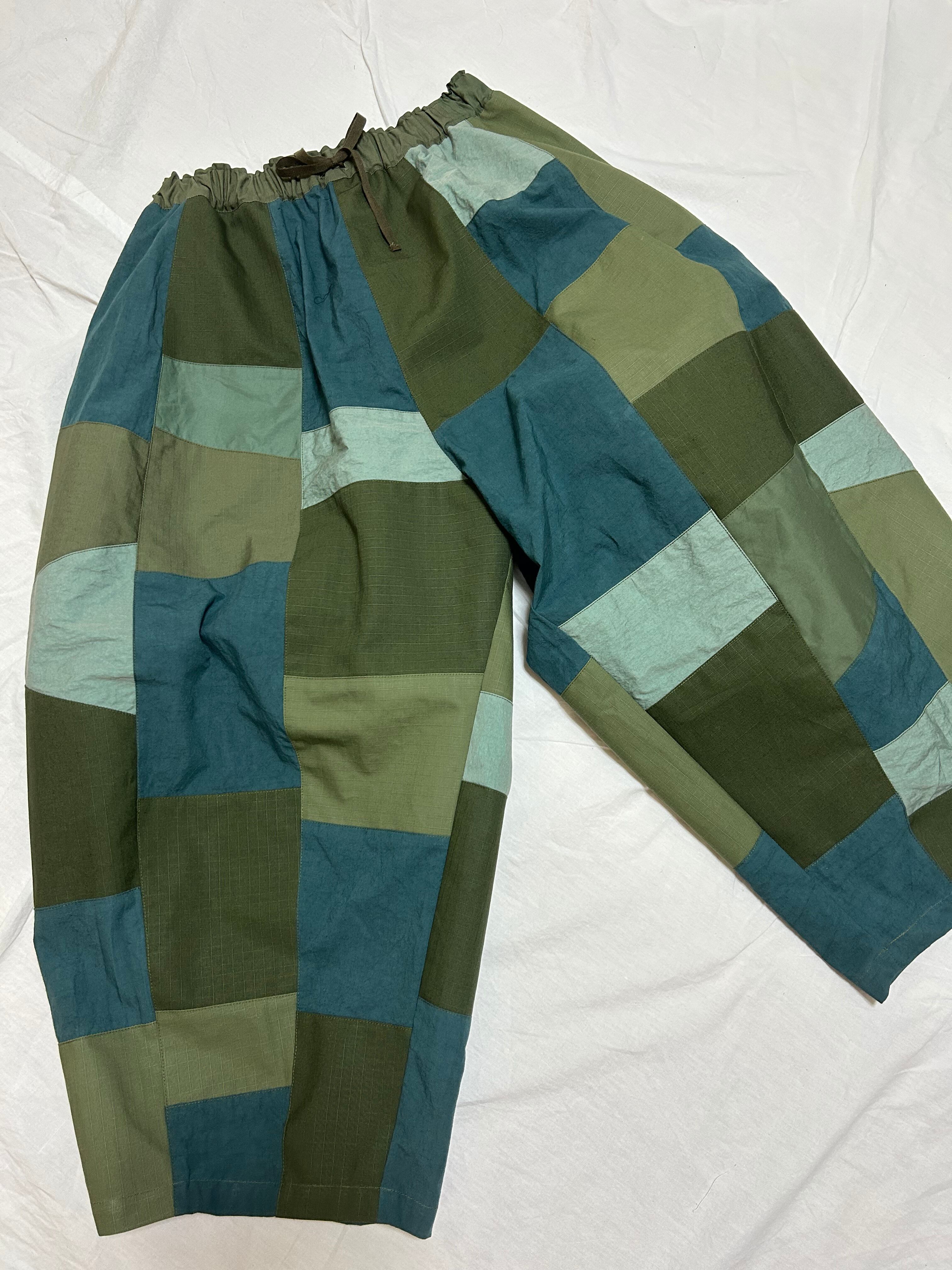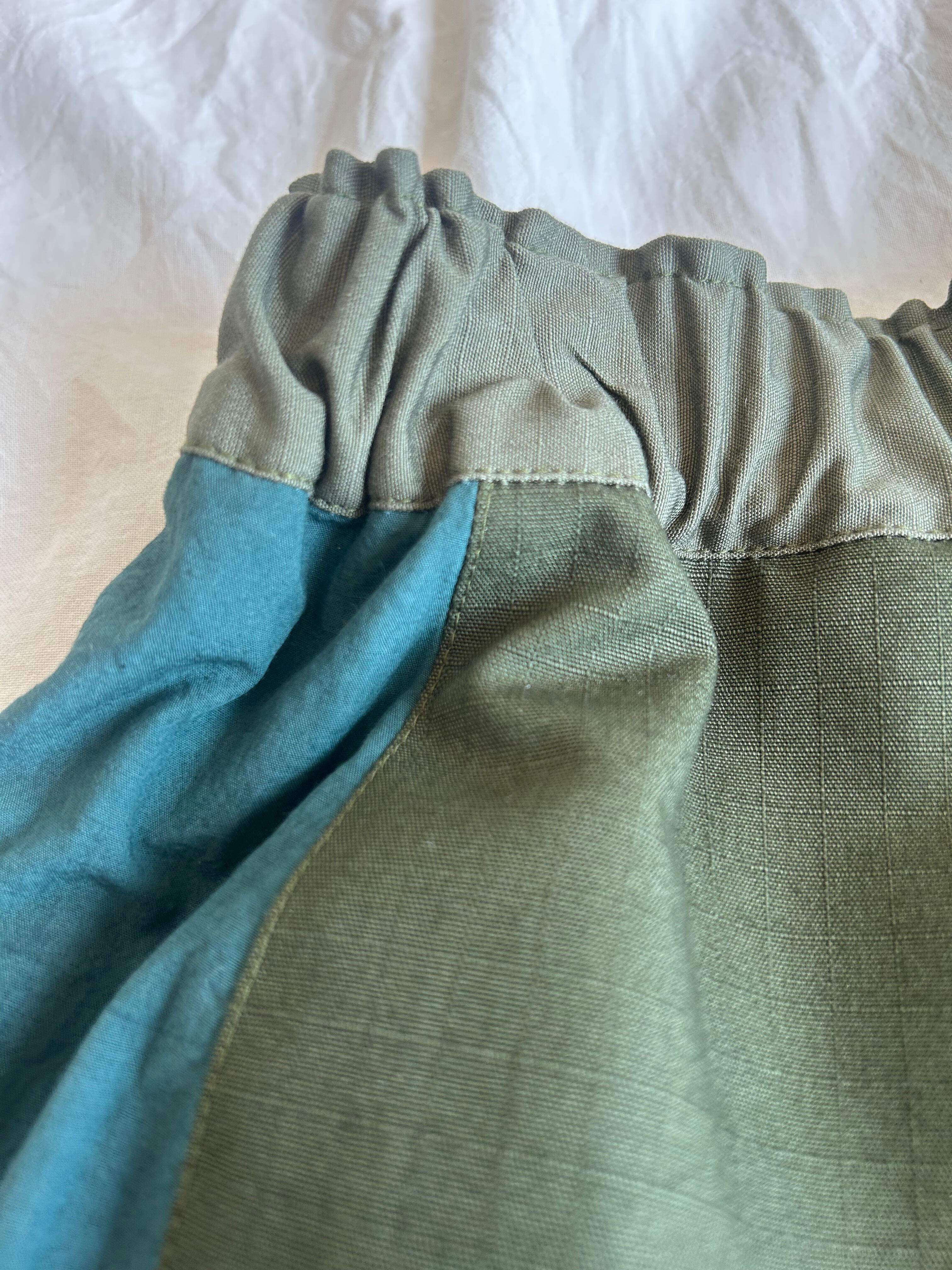 コットンダンプ、綿麻ダンプ、コットンナイロンウェザークロス、リップクロスを繋いでパンツを作りました。