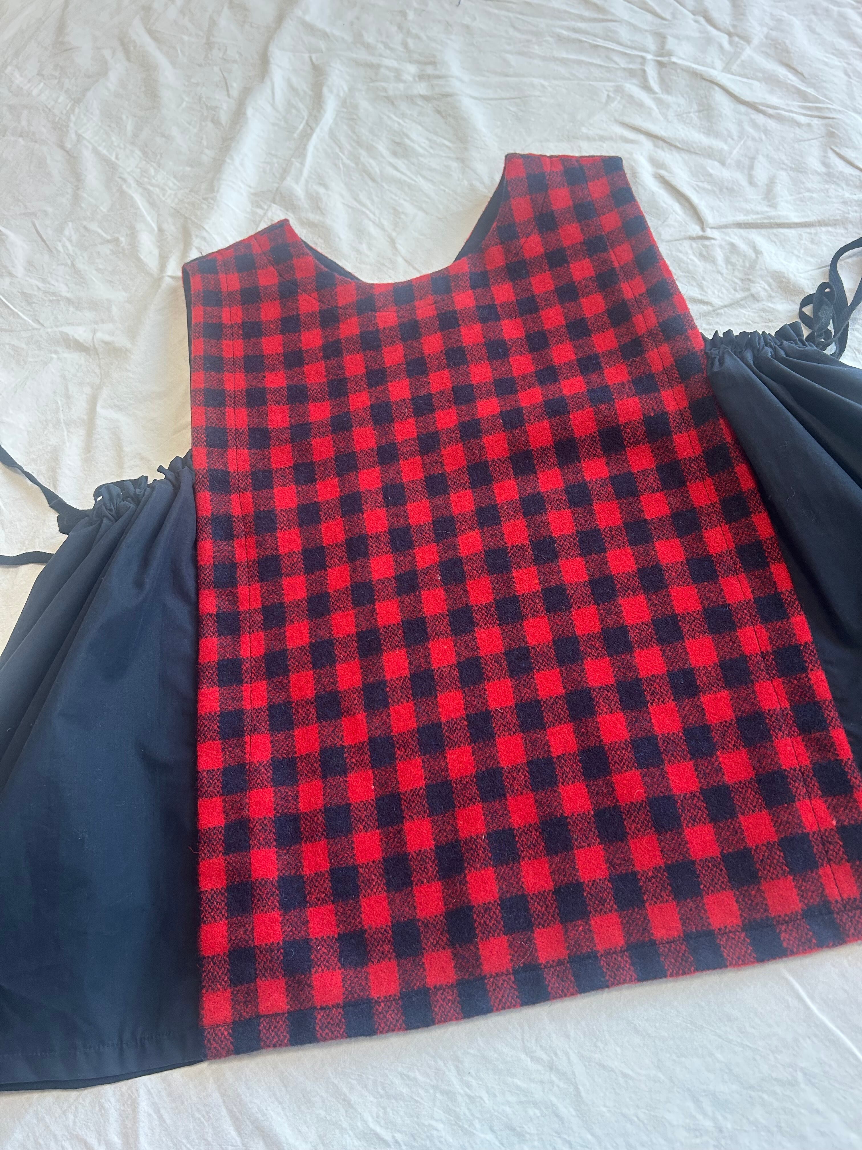赤のチェックウール生地にコットンジャガード生地を合わせて作りました^^