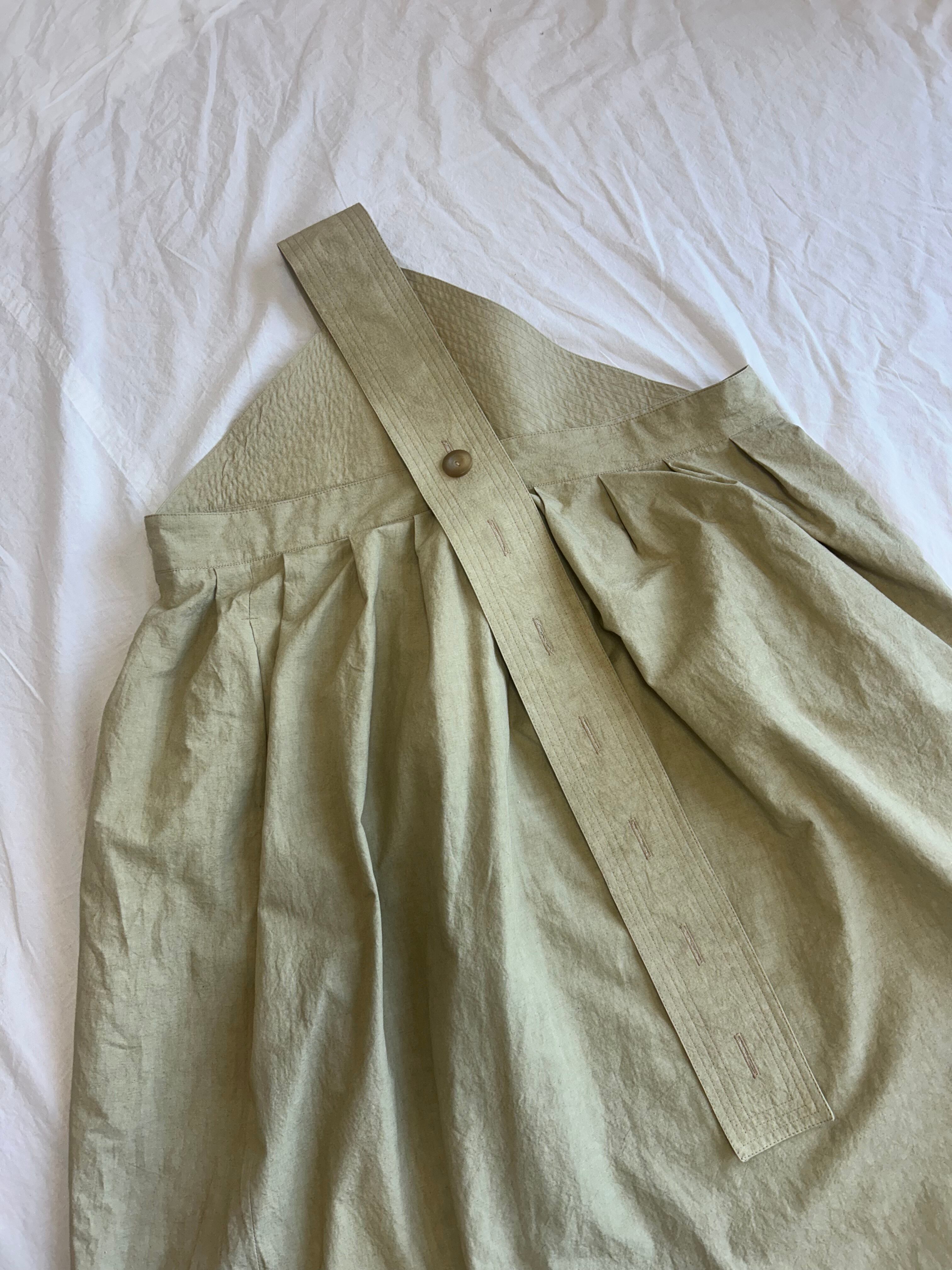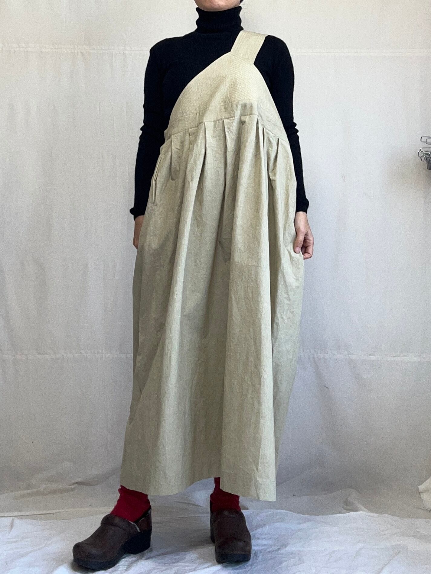 ボタンで長さを調節できるのでワンピースとしてスカートとしてコーディネートを楽しめる服。