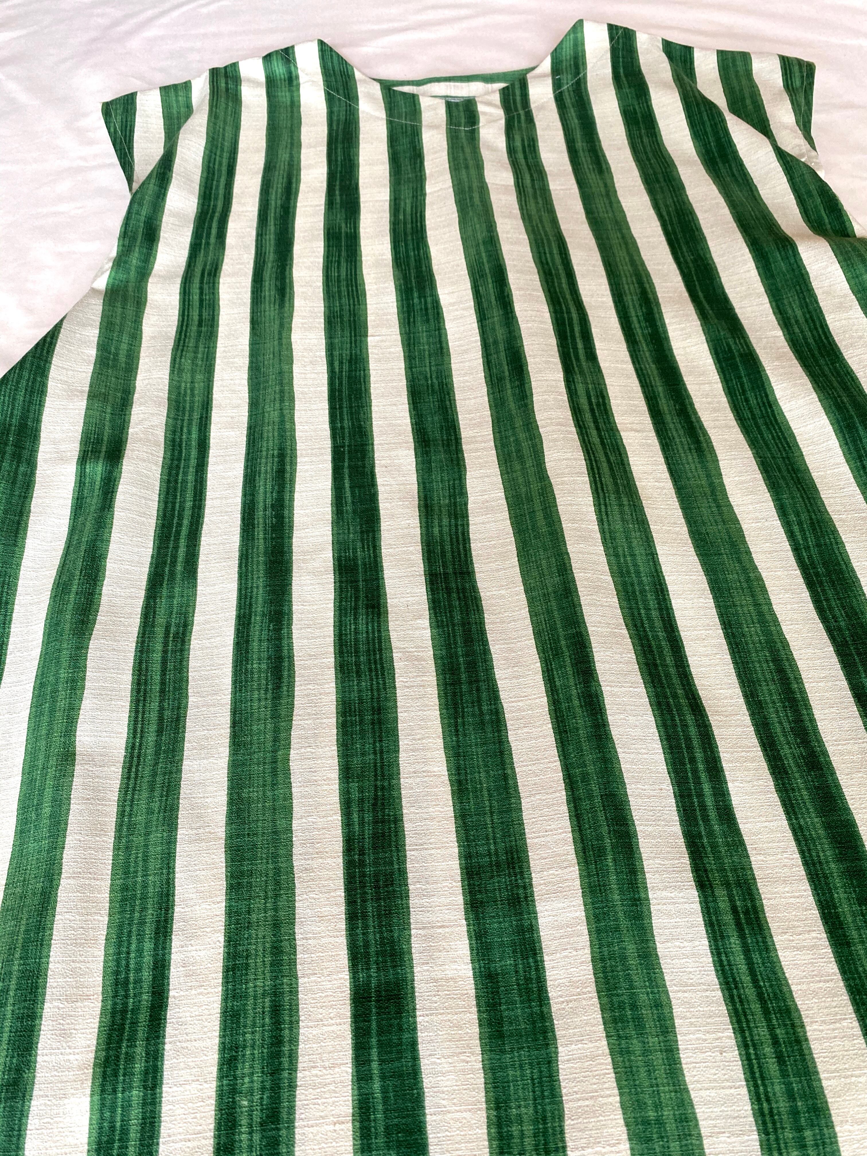 竹を思わせるようなグリーンのストライプ、素材はバニランプリント(綿100%)肌触りはサラリとしています。