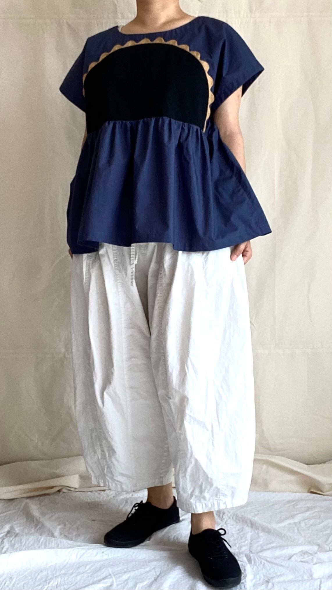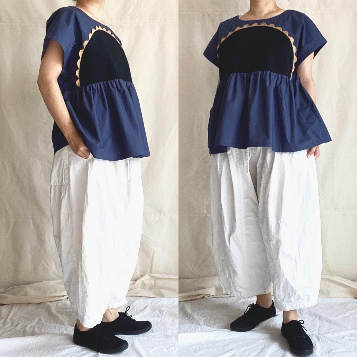 胸元に半円に山道テープを挟んだ飾りを付けたワンピースです◎
