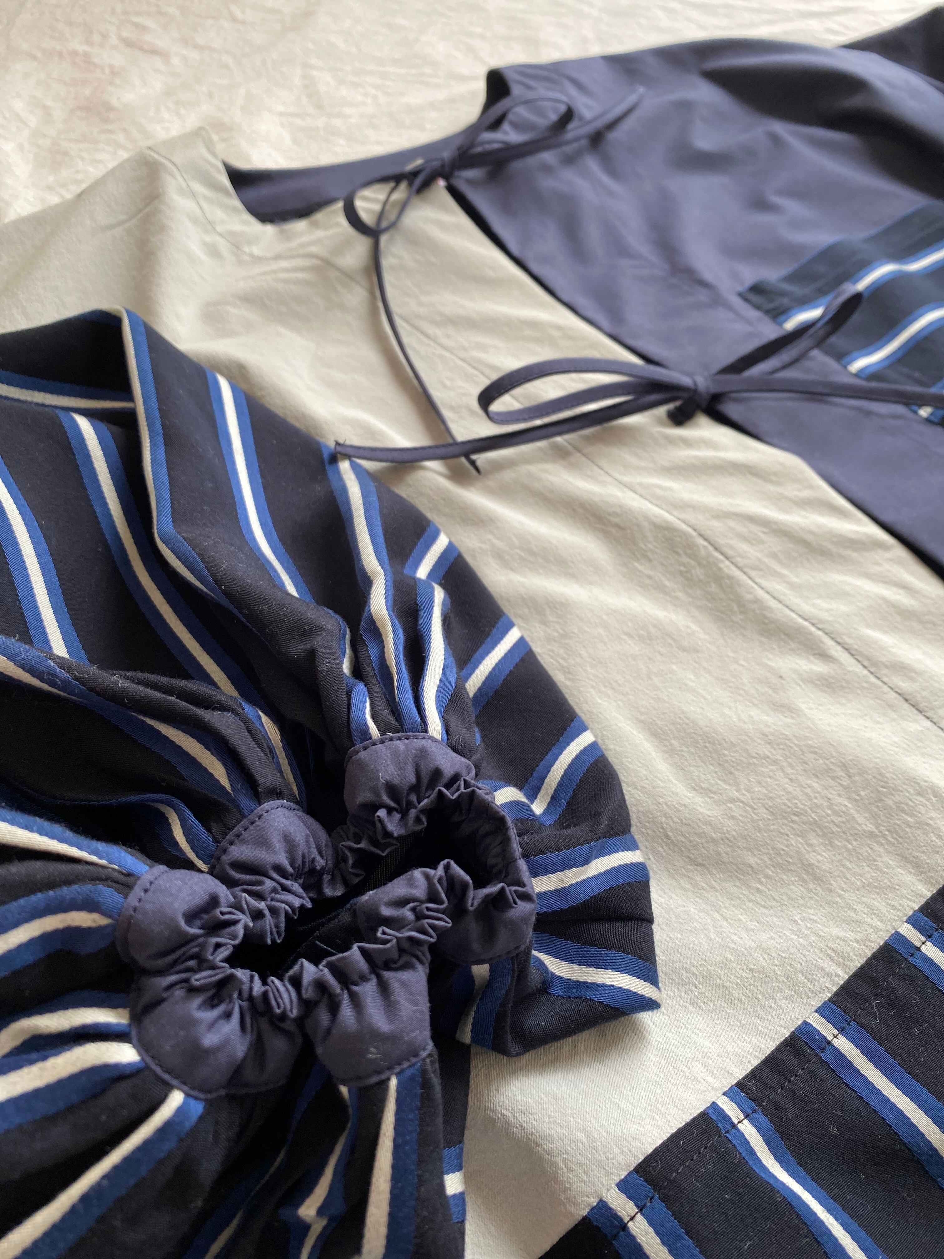 4種類の生地を合わせてパフスリーブのシャツワンピースを作りました。