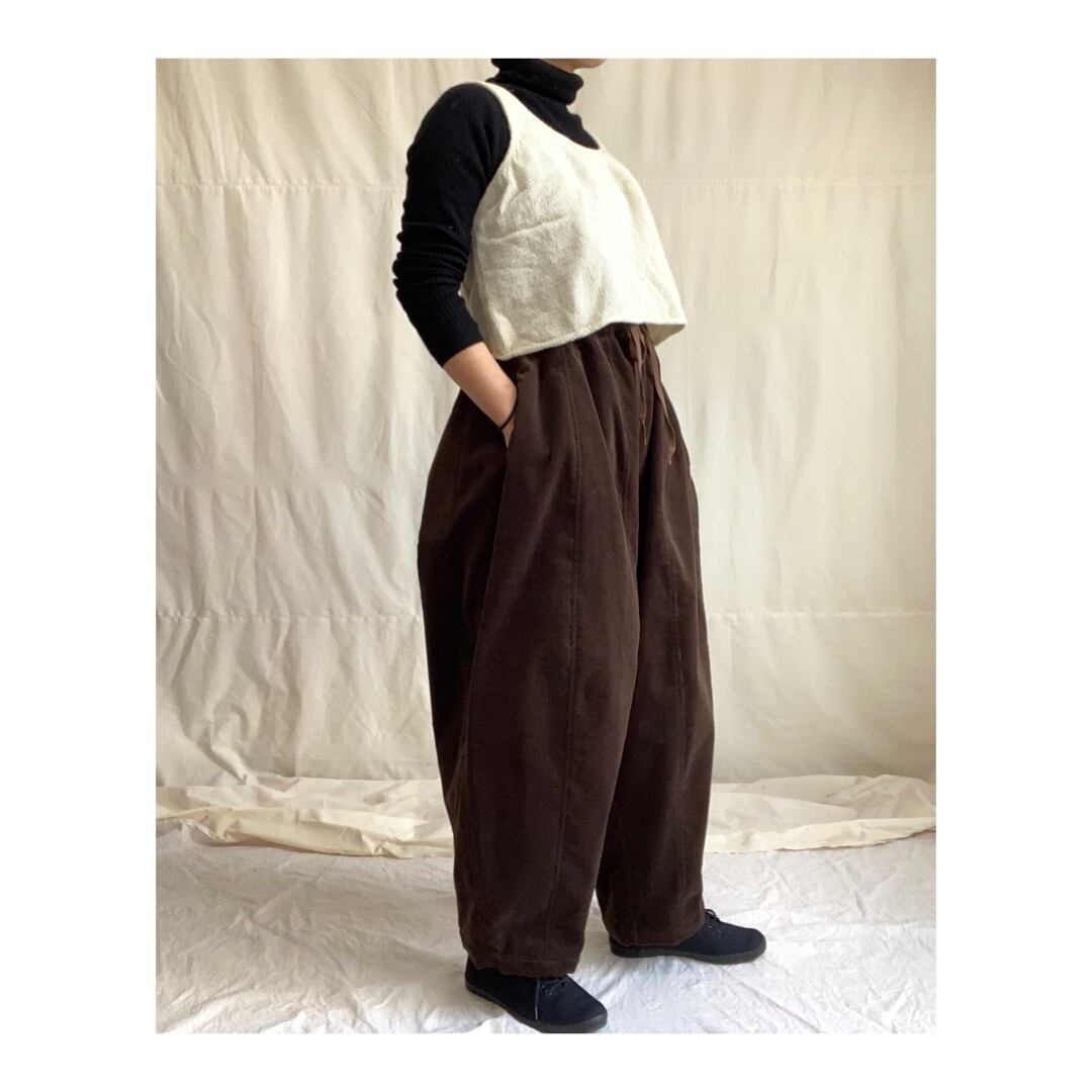 ウエストから膝あたりにかけて広がり、裾まで緩やかに狭くなるパンツです。