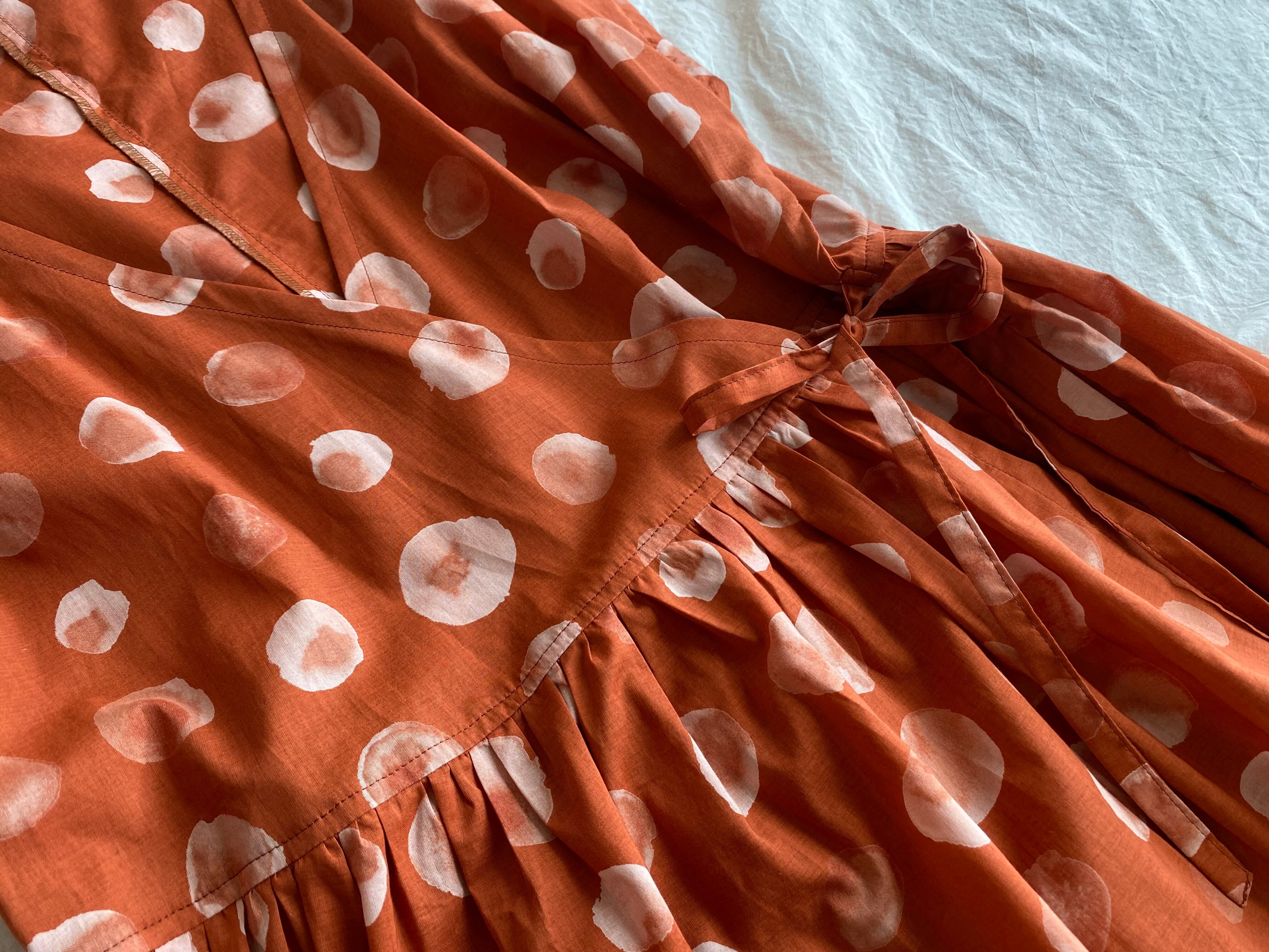 エレガントなフレンチスリーブが印象的なカシュクールワンピース。柔らかい生地が身体に優しく、動きやすい着心地です。手描き風のドット柄が女性らしさを引き立てます。