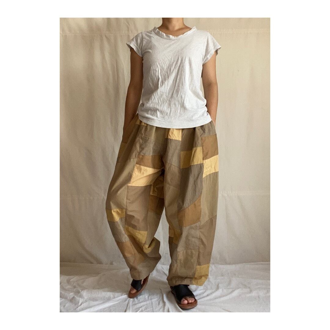 ベージュ系のコットン、綿麻、コットンナイロンの生地をツギハギして作りました。