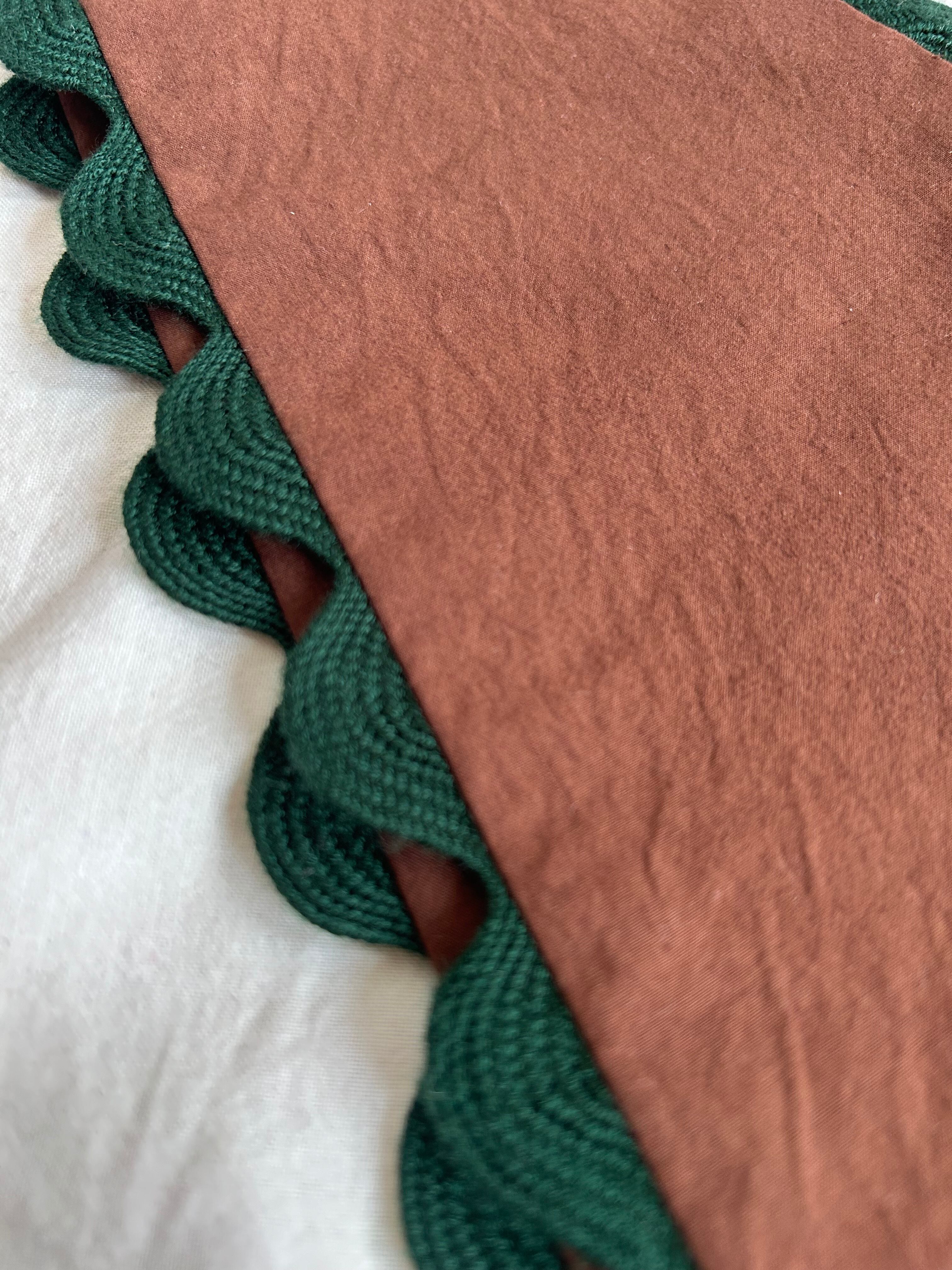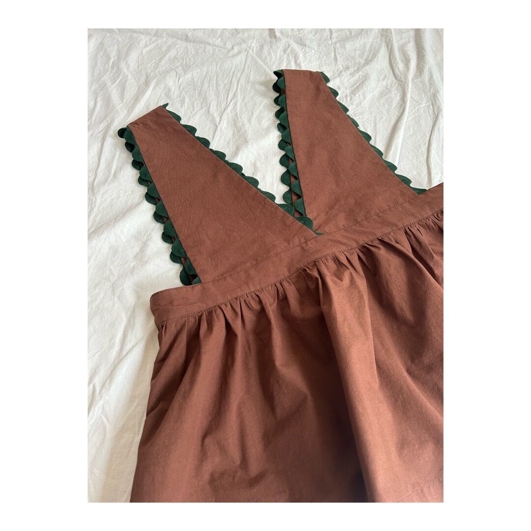 ブラウンのタイプライター生地とグリーンの山道テープが大人かわいいベストです。