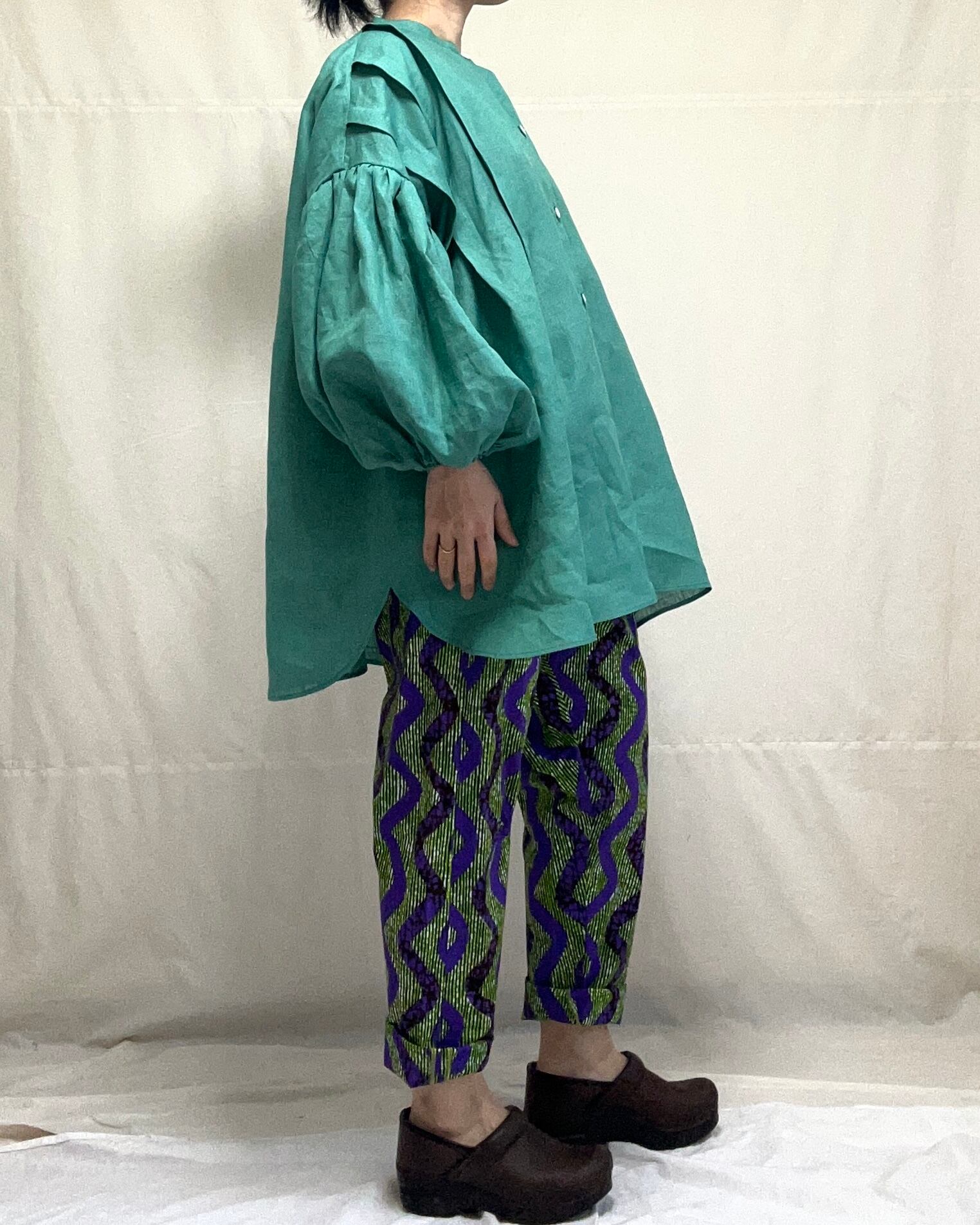 肩にタックを3つ、袖はギャザーたっぷりのブラウスです。