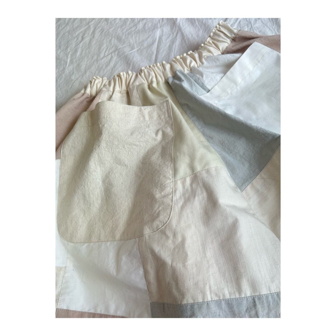ホワイト、アイボリー、ベビーピンク、ベビーブルーのいろんな生地をランダムに繋ぎ合わせて作りました。
